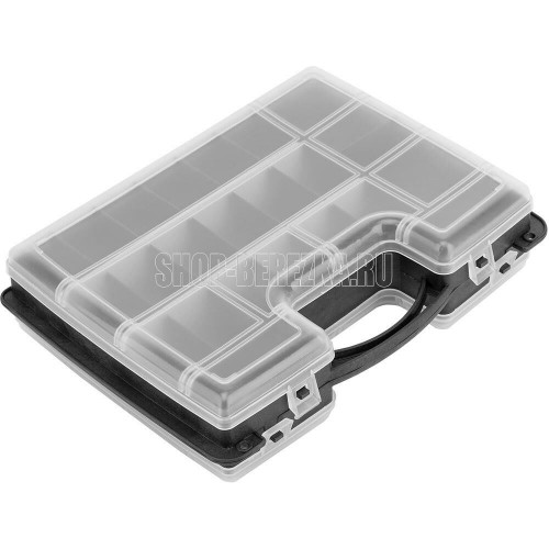 Двухсторонний органайзер Сибртех 90738 размером 295 х 220 х 76 мм помогает рассортировать мелкие вещи и хранить их в порядке и безопасности. В него можно положить снасти, крепеж, элементы рукоделия и т.д. Органайзер не занимает много места, поэтому его можно поместить под кровать, на стеллаж и в другие укромные места. Преимущества Полипропиленовый корпус отличается прочностью и износостойкостью, поэтому обеспечивает защиту вещей от пыли и влаги.Благодаря прозрачной крышке можно быстро просматривать содержимое органайзера.Органайзер оснащен 32 секциями различного размера для удобства хранения мелких и крупных предметов.За счет наличия ручки органайзер удобно транспортировать и брать на выездные работы.