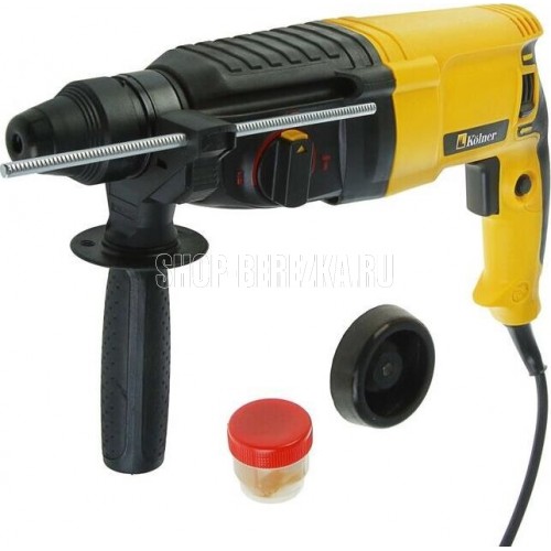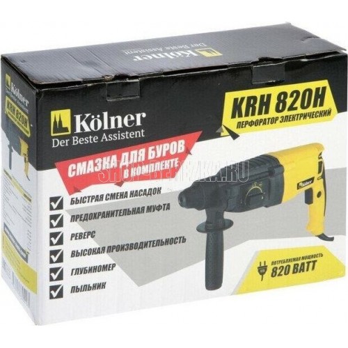 Перфоратор KOLNER KRH 820H: Напряжение/частота: 220 В ± 10%/50 Гц. Потребляемая мощность: 820 Вт. Энергия удара: 2,5 Дж. Число оборотов на холостом ходу: 0-1300 об/мин. Частота ударов: 0-5500 уд/мин. Режим работы: сверление/ сверление с ударом/долбление. Патрон: SDS-plus. Максимальный диаметр сверления: дерево - 38 мм, бетон - 26 мм, металл - 13 мм. Длина сетевого кабеля: 2 метра. Масса: 3,1 кг.