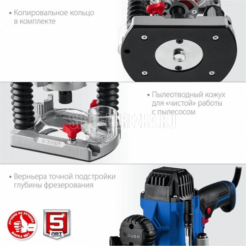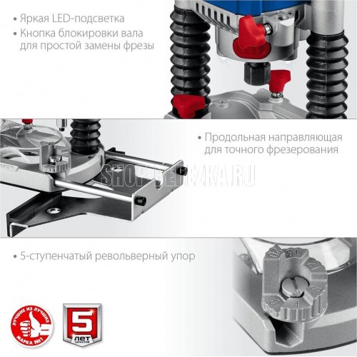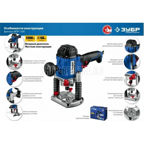 Мощность, Вт 1200. Число оборотов, об/мин 10000-30000. Рабочий ход фрезы, мм 50. Размер цанги, мм 6/8. Макс диаметр фрезы, мм 41. Регулировка оборотов есть. Точная подстройка глубины фрезерования есть. Копирование (по шаблону, по радиусу, фигурное) есть. Патрубок пылеотвода есть. Диаметр патрубка (внут./наруж.), мм 32 / 37. Наличие подсветки есть. Фиксация кнопки включения есть. Длина кабеля, м 3.