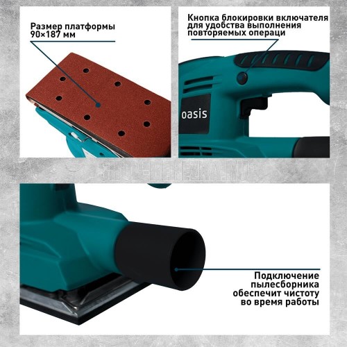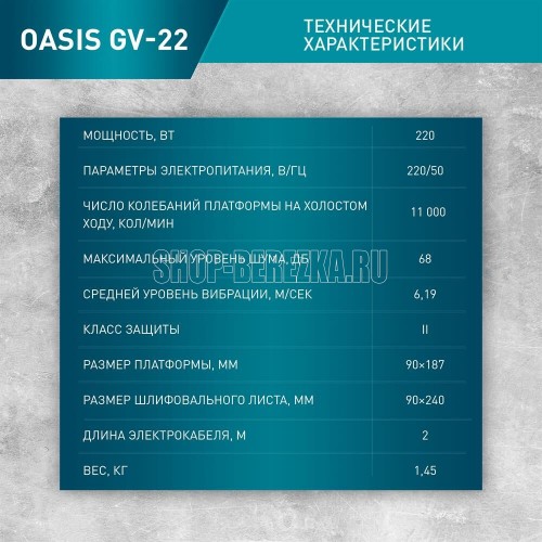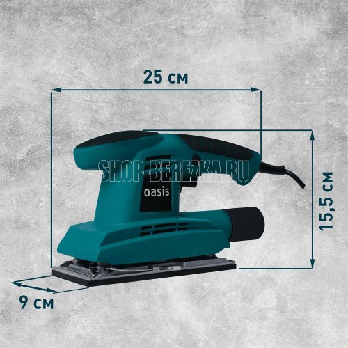 Мощность, Вт 220. Параметры электропитания, В/Гц 220/50. Число колебаний платформы на холостом ходу, кол/мин 11000. Размер платформы, ШхД мм 90x187. Размер шлифовального листа, мм 90х240. Размеры изделия, см 25х9х15,5. Вес нетто, кг 1,54.