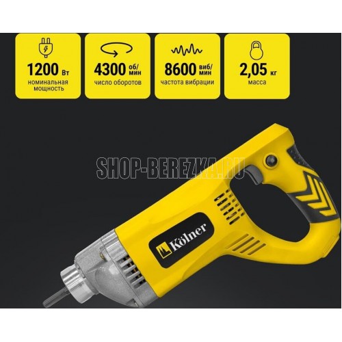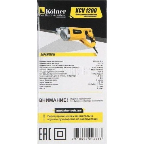 Номинальная мощность: 1200 Вт. Параметры питания: 220-240 В ~ 50 Гц. Число оборотов шпинделя на холостом ходу: 4300 об/мин. Частота вибрации: 8600 виб/мин. Посадка булавы вибратора: HEX 8. Тип резьбы булавы вибратора: М40, левый. Рекомендуемая длина булавы вибратора: 1,5-3 м. Длина шнура питания: 2 м. Габаритные размеры: 33х16х8 см. Масса: 2,05 кг.