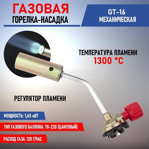 Газовая горелка-насадка, мощность: 1,65кВт 1,420 ккал , температура пламени: 1300 С (макс.), расход газа: 120 гр/ч, тип поджига: ручной, материал: сталь+ сплав цинка + пластикк, сфера применения: от плавления и сварки до копчения продуктов, тип газового баллона: ТВ-220 (цанговый).