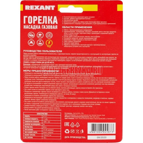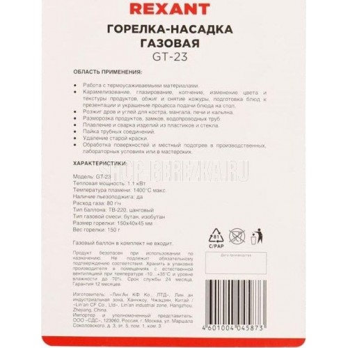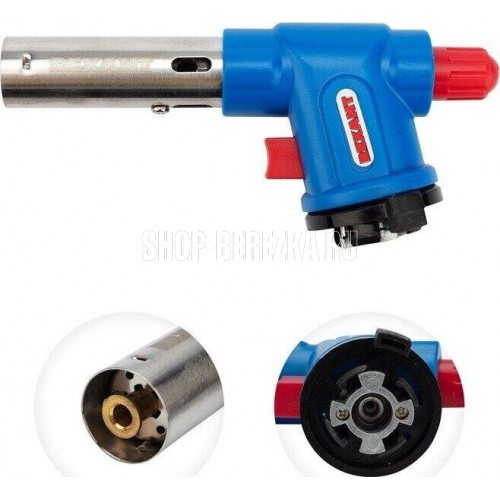 Газовая горелка-насадка, мощность: 1,1кВт 0,946 ккал , температура пламени: 1400 С (макс.), расход газа: 80 гр/ч, тип поджига: встроенный пьезо, материал: медь + нержавеющая сталь + алюминий + сплав цинка + пластик, сфера применения: от плавления и сварки до копчения продуктов, тип газового баллона: ТВ-220 (цанговый).