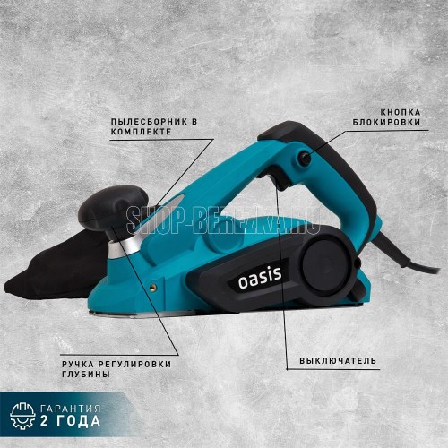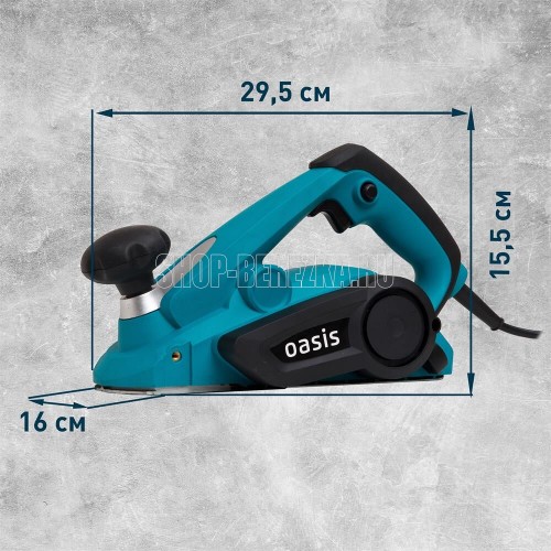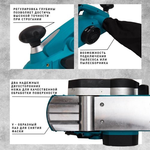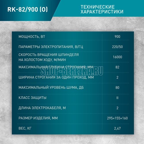 Мощность, Вт 900. Параметры электропитания, В/Гц 220/50. Скорость вращения шпинделя на холостом ходу, об/мин 16000. Ширина строгания за один проход, мм 82. Максимальная глубина строгания, мм 2. Размеры изделия, см 29,5х15,5х16. Вес нетто, кг 2,47.