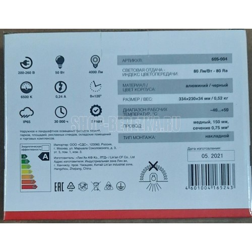 Прожектор светодиодный 50 Вт 200–260В IP65 4000 лм 6500 K холодный свет холодный свет REXANT. Самый ликвидный ассортимент Высокая цветопередача и светоотдача Высокий коэфицент мощности Тип монтажа: накладной Номинальная мощность, Вт: 50 Номинальное напряжение, В: 230 Частота сети, Гц: 50 Диапазон рабочих напряжений, В: 200-260 Рабочий ток, А: 0,24 Цветовая температура, К: 6500 Световой поток, Лм: 4000 Световая отдача, Лм/Вт: 80 Угол рассеивания, град: 120 Индекс цветопередачи, Ra: 80 Класс защиты, IP: 65 Коэффициент мощности, cos?: 0,9 Класс энергоэффективности: A Тип кривой силы света: Д Минимальное расстояние до освещаемого объекта, м: 1 Освещаемая площадь (15 люкс), м2: 250 Высота монтажа (для получения 15 люкс на поверхности), м: 9 Материал шнура: медь Длина шнура, мм: 150 Сечение шнура, м2: 1...0,75 Материал корпуса: алюминий Цвет корпуса: черный Длина, мм: 195 Ширина, мм: 45 Высота или глубина, мм: 155 Вес, кг: 0,52