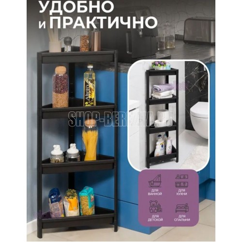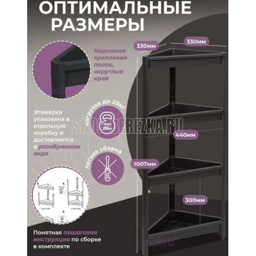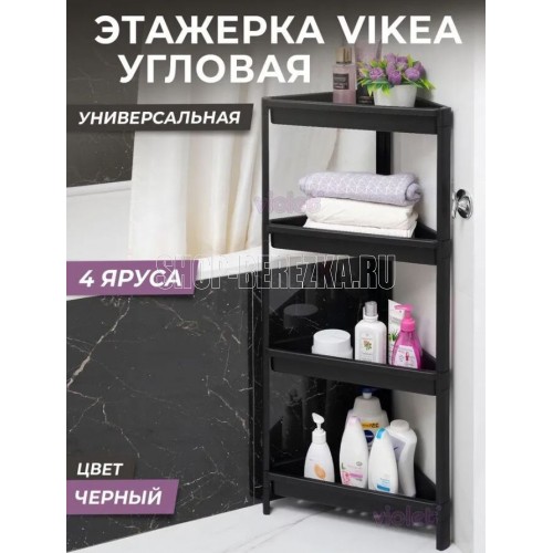Размер этажерки - 330х330х1007мм Вес товара, г 1372 Этажерка для хранения вещей VIKEA - это идеальное решение для организации пространства на Вашей кухне и в ванной, в гостиной и на балконе, а также в любом другом помещении. Угловая этажерка для кухни состоит из 4х ярусов, очень удобная и компактная, но в тоже время вместительная, прекрасно впишется в пространство любой комнаты. Стеллаж имеет оптимальное расстояние между полками. Это позволяет разместить все самые необходимые полезные в хозяйстве мелочи. Стойки сконструированы таким образом, что при вхождении их в полку создаётся надёжное соединение внутренним замком, что обеспечивает монолитность конструкции и дает возможность поднять и переместить этажерку за верхнюю полку.
