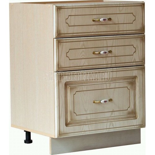 Модуль кухни "Анжелика"-Стол 3 ящика 600. Размер ШхГхВ (600х510х820)мм с ножками но без столешницы, высота со столешницей 860 мм. Кухня Анжелика в классическом стиле, сочетающая роскошь классики с современной практичностью - гарнитур из модульной системы фабрики Бител. Красивые патинированные фасады из МДФ с роскошной фрезеровкой, подчеркнутой золотом, имитируют натуральное дерево и способны создать поистине дворцовую обстановку на вашей кухне. Фрезеровку фасадов дополняют балюстрады с балясинами, рамочные фасады с рисунками на стекле, классические ручки под бронзу с керамической вставкой. Модульную систему характеризуют качественные материалы и фурнитура, большое число модулей различного назначения и размеров на выбор, модули с радиусными фасадами, фасады с фрезеровкой, резной декоративный багет.