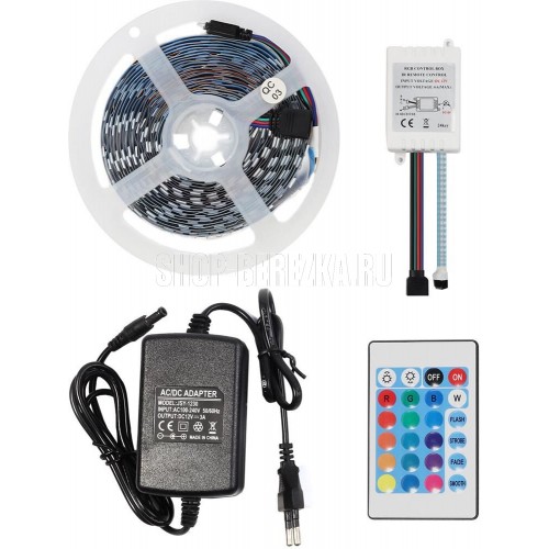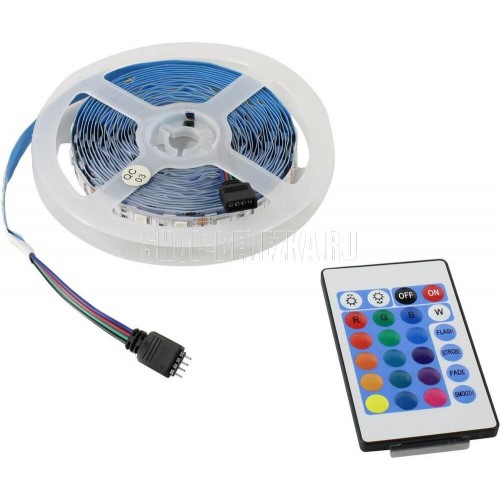 Кол-во диодов: 60 SMD(5050)/м, RGB Мощность: 9 Вт/1 м, Напряжение: 12 В Катушка 5 м, Пылевлагозащита IP20, 720лм/м контроллер RGB + драйвер 12 В + 24 клавишный ПДУ