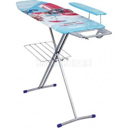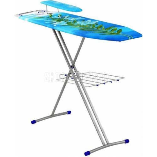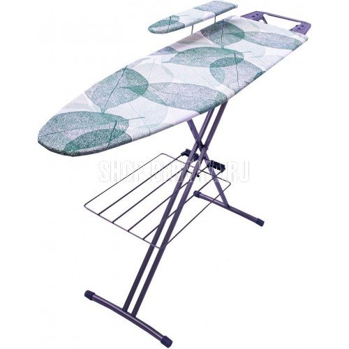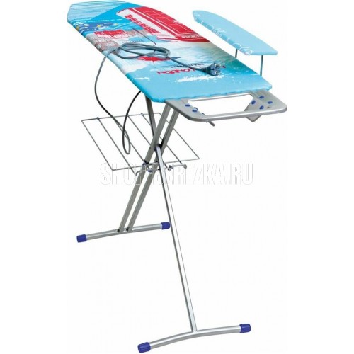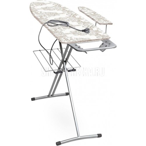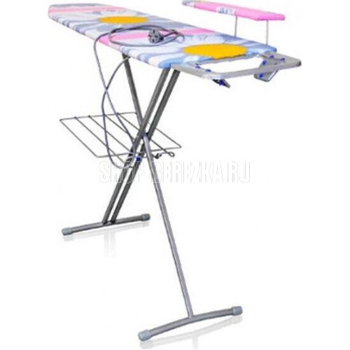 Гладильная поверхность -фанера (1225х345мм), два положения высоты h-70см, h-85см, EUROподставка под утюг с термосиликоном, съемный подрукавник, электросоединитель 2,2м, розетка, полка для белья, материал чехла-хлопок, max нагрузка на глад.поверхность 15.Цвет в ассортименте.