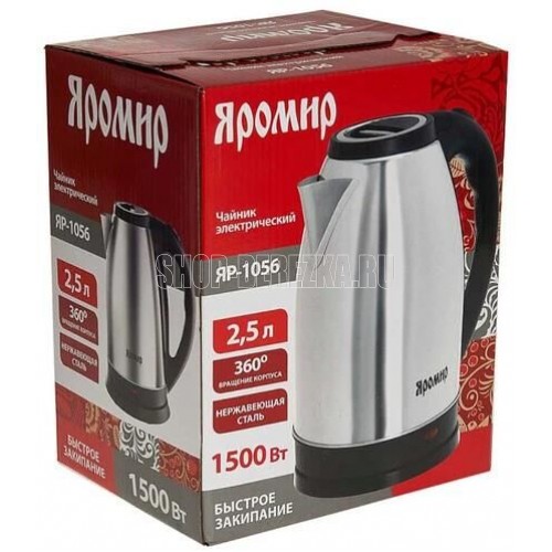 ЯРОМИР ЯР-1056 Параметры Объем 2,5 л Номинальная потребляемая мощность 1500 Вт Описание Закрытый нагревательный элемент из нержавеющей стали Корпус из высококачественной нержавеющей стали с глянцевой полировкой Вращение корпуса на 360° Цвет: черный Световой индикатор работы База питания с отсеком для хранения шнура Автоматическое отключение при закипании Блокировка включения без воды Упаковка: цветная коробка