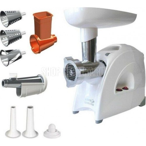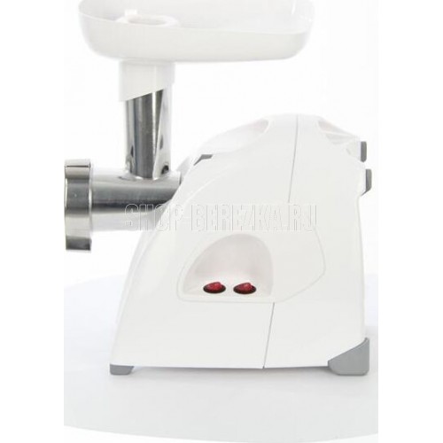 Панель управления механическая. Длина провода 1,5 м. Материал ножей нержавеющая сталь. Производительность 4 кг/мин. Реверс. Мощность 2000 Вт. Цвет белый. Производительность — до 3 кг фарша в минуту. Двойная защита от перегрузки. Функция «реверс» для предотвращения наматывания жилок на шнек. Отсек в корпусе для шнура питания, хранения ножа и насадок. Особая заточка ножа и решетки увеличенной толщины из нержавеющей стали, обеспечивающие высокое качество фарша из всех видов мяса и других продуктов. До 30 минут непрерывной работы. 2 вида решеток для получения фарша разной консистенции - с диаметром отверстий 4,9 мм и 8,5 мм. Высокое размещение шнековой камеры. - эргономичная гайка для удобной сборки/разборки мясорубки; - ручка для переноски; - устойчивые нескользящие ножки для фиксации мясорубки на поверхности стола; - возможность вертикального хранения для экономии пространства на кухне;