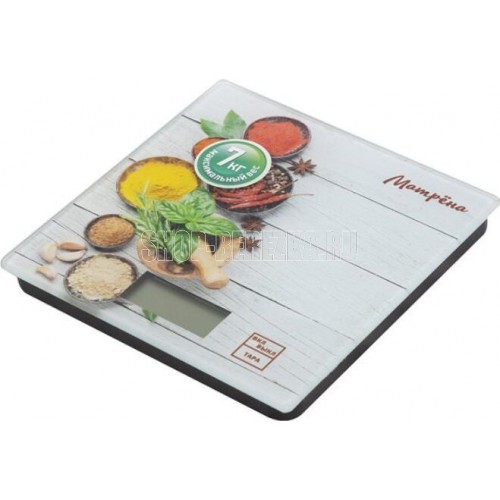 МАТРЁНА MA-033, 7 кг, специи Тип электронные Платформа, мм 150х150 Назначение бытовые Мах вес, кг 7 Пылевлагозащитные нет Вес нетто, кг 0.385 Габариты без упаковки, мм 160х150х23 Элементы питания CR2032 Количество и напряжение элементов питания 1х3В Чаша нет Сенсорное управление да Автоматическое включение нет Автоматическое выключение да Индикация перегрузки да Индикация разряда батареи да Прорезиненные ножки нет Материал платформы/чаши закаленное стекло
