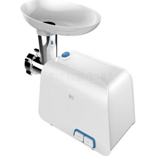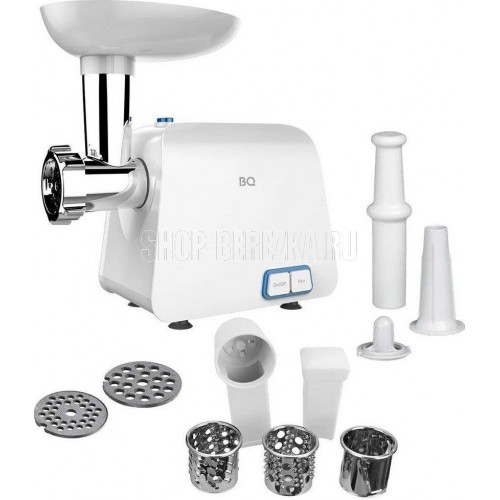 BQ MG1004 WHITE-BLUE Мощность 2100 Вт Функция реверса 2 диска для разных видов фарша (5 мм и 7 мм) Нож из нержавеющей стали Насадка для колбасок и кеббе Овощерезка с 3 барабанами Мытье в посудомоечной машине