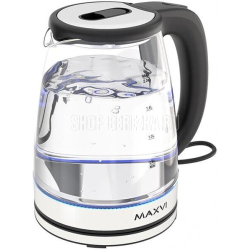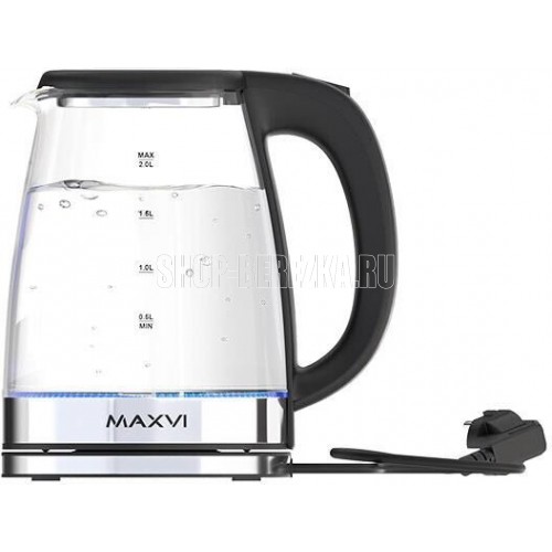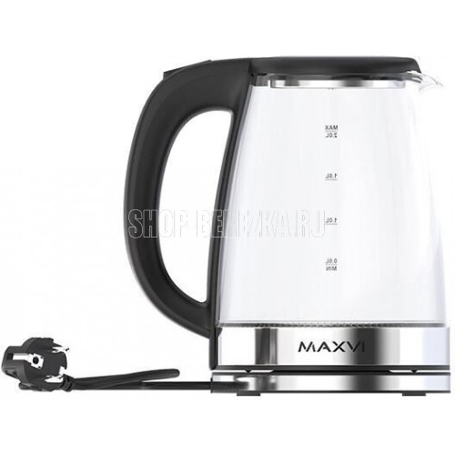 Мощность 1500 Вт, 2.0 литра, стеклянный корпус, LED-подсветка, подставка с вращением 360 градусов, шкала уровня воды, автоотключение, скрытый нагревательный элемент.