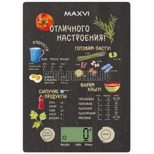 Максимальный вес 5 кг, цена деления 1 г, функция «Тара», взвешивание продуктов и определение объема жидкости, сенсорное управление, платформа из сверхпрочного стекла в оригинальном дизайне, нескользящие ножки, питание 3В (батарейка CR2032 в комплекте)