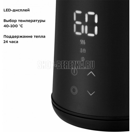 Мощность 1500 Вт. Максимальный объем 1.6 л. Нагревательный элемент скрытый. Индикация включения. Дополнительные функции поддержание температуры, регулировка температуры нагрева Безопасность. автоотключение, защита от включения без воды Конструктивные особенности дисплей, кнопка открытия крышки, подставка 360, фильтр от накипи. Температурные режимы 5 шт.