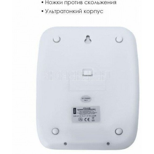 ATLANTA ATH-6198 (WHITE)Яркий LED дисплей Высокая точность взвешивания 1 г Функция обнуления веса Автоотключение Предел взвешивания 5 кг Индикатор слабых батареек Индикатор перегрузки Работает от 1 x 3В тип CR2032