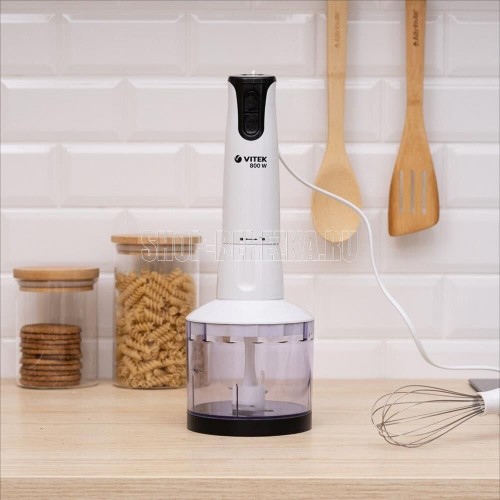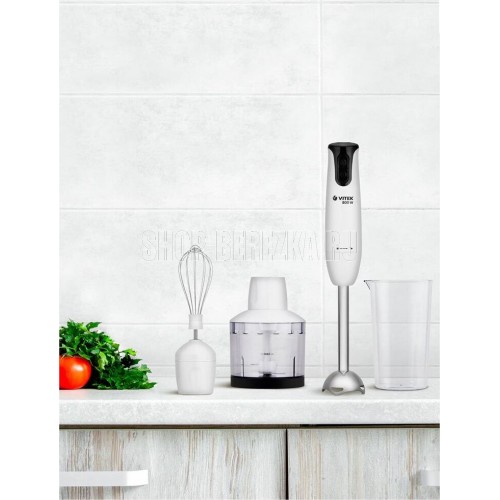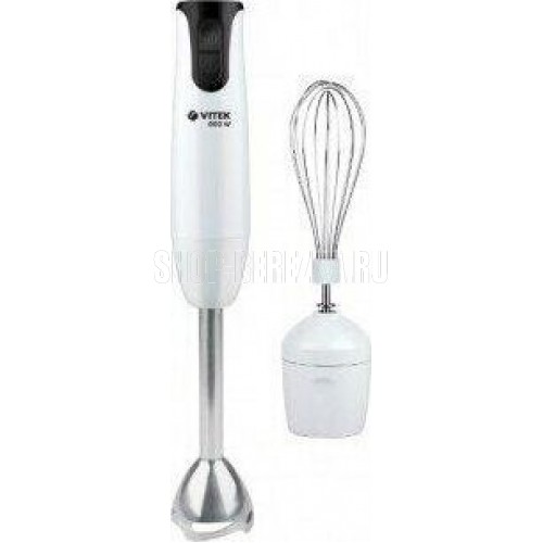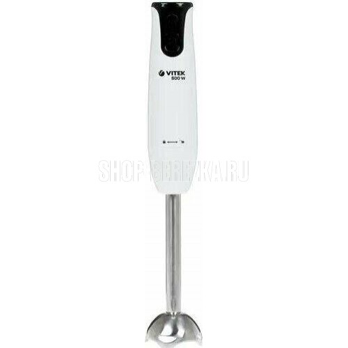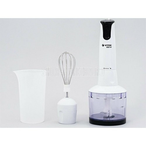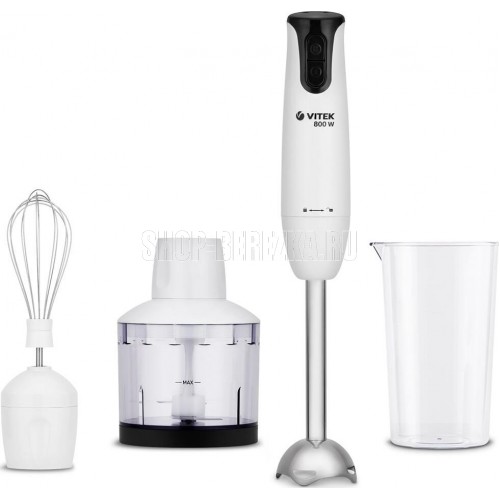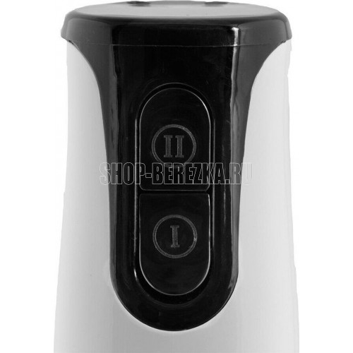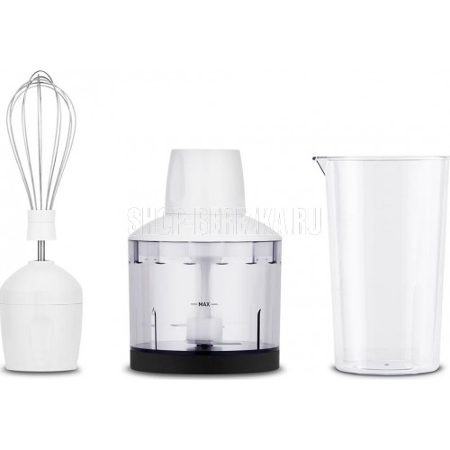 Блендер погружной. Мощность: 800 вт, Количество скоростей: 2, Турборежим, Управление: механическое, Материал корпуса: пластик, Материал погружной части: нержавеющая сталь, Емкость измельчителя: 500 мл, Емкость мерного стакана: 700 мл, Венчик для взбивания, Мерный стакан, Длина сетевого шнура: 120см, Измельчитель, Цвет: Белый