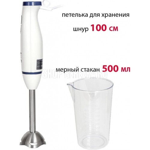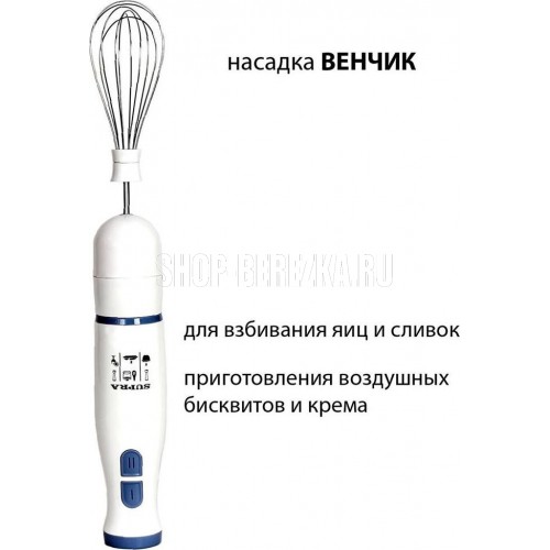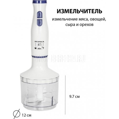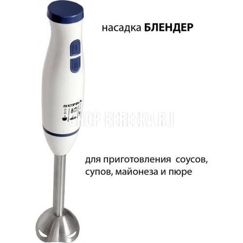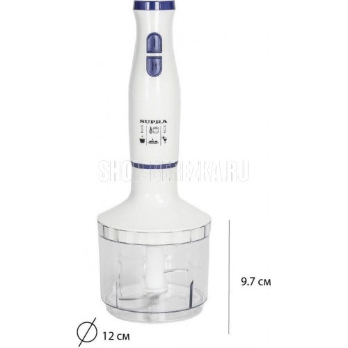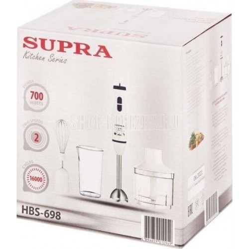 SUPRA HBS-698 Основные характеристики Мощность, Вт. 700 Количество скоростей 2 Материал погружной части нержавеющая сталь Комплектация: блендер, съемная насадка-венчик, мерный стакан 500 мл, измельчитель 500 мл, гарантийный талон, инструкция на русском языке Корпус: Материал корпуса пластик Цвет белый с синим Энергопотребление Электропитание, в., Гц. 220-240, 50