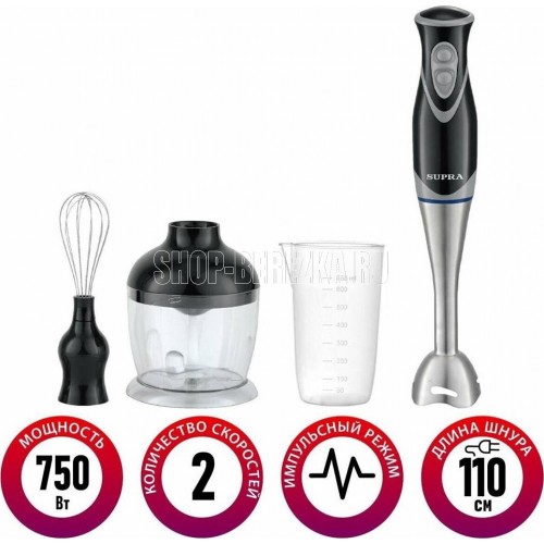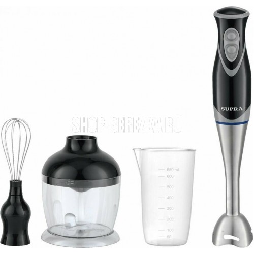 SUPRA HBS-995 Основные характеристики Мощность, Вт. 750 Количество скоростей 2 Импульсный режим работы Материал лезвий нержавеющая сталь Комплектация Комплектация блендер, съемная насадка-венчик, мини-измельчитель 750 мл, мерный стакан для взбивания 650 мл Корпус Материал корпуса пластик Энергопотребление Электропитание, в., Гц. 220-240, 50 Артикул HBS-995