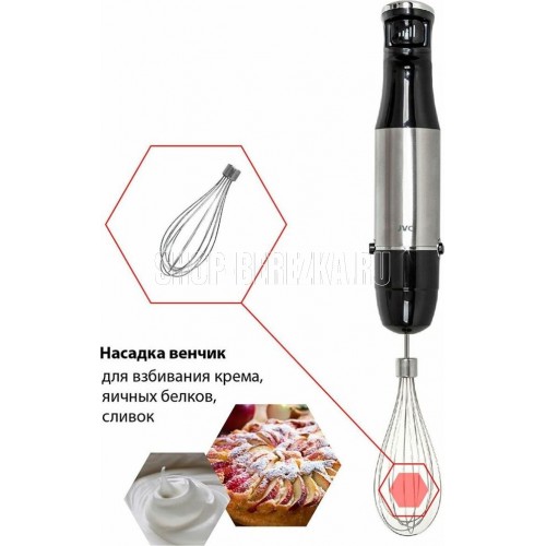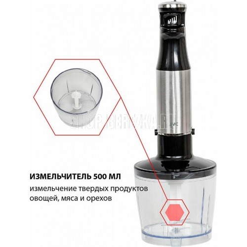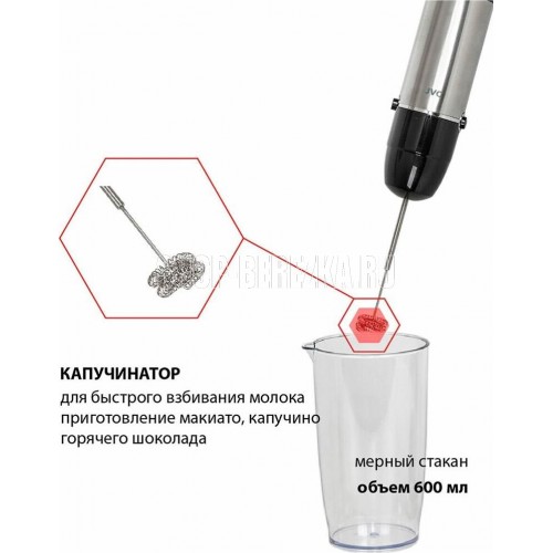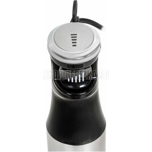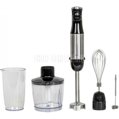 Блендер погружной, набор, максимальная мощность 1200 ватт, бесступенчатая регулировка скорости в одно касание, светодиодная подсветка, измельчитель 500 мл, мерный стакан 600 мл, венчик для взбивания, венчик для вспенивания молока, петля для подвешивания, длина кабеля 1,15 м.