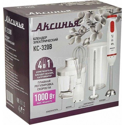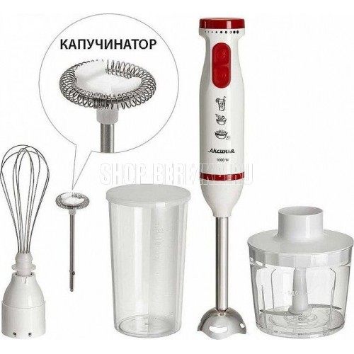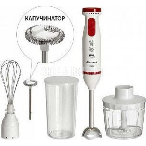 Параметры Максимальная мощность 1000 Вт Номинальная потребляемая мощность 600 Вт Объем чаши измельчителя 500 мл Объем мерного стакана 700 мл Описание Блендер электрический предназначен для смешивания, измельчения и взбивания продуктов и жидкостей в бытовых и аналогичных условиях Цвет: белый с красным Насадка и нож из нержавеющей стали Специальная заточка ножей Мерный стакан с крышкой Четыре сменные насадки: капучинатор из нержавеющей стали для приготовления молочной пенки, используемой для кофе измельчитель для измельчения орехов, трав, яиц, мяса, сыра, лука, рыбы, хлеба, чеснока, овощей и т.п. насадка для измельчения и смешивания для работы с мягкими и жидкими продуктами (приготовление соусов, супов, майонеза, детского питания, пюре, всех видов коктейлей и т.п.) венчик для взбивания яичных белков, сливок, смешивания жидких продуктов, замешивания жидкого теста Плавная регулировка скорости Режим «ТУРБО» Упаковка: цветная коробка