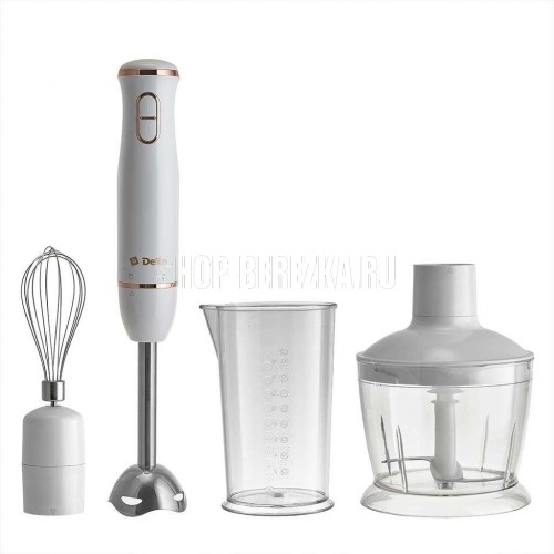 Блендер погружной (набор). Мощность 1200 Вт, Потребляемая мощность: 500 Вт, Объем чаши измельчителя 1000 мл, Объем мерного стакана 500 мл, Три сменные насадки: для смешивания, венчик, измельчитель, Мерный стакан, Ножи из нержавеющей стали, 2 скорости работы, Цвет: белый.