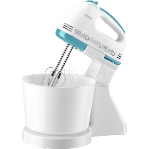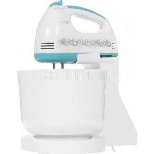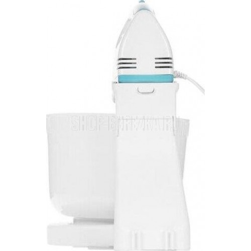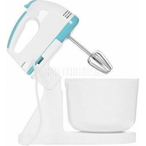 Миксер ручной с чашей, Механический, Объем чаши 2 литра, Максимальная мощность 300 Вт, 7 скоростей, Насадки для взбивания яиц, крема, теста, Маетриал корпуса - пластик, Цвет корпуса белый с синим.
