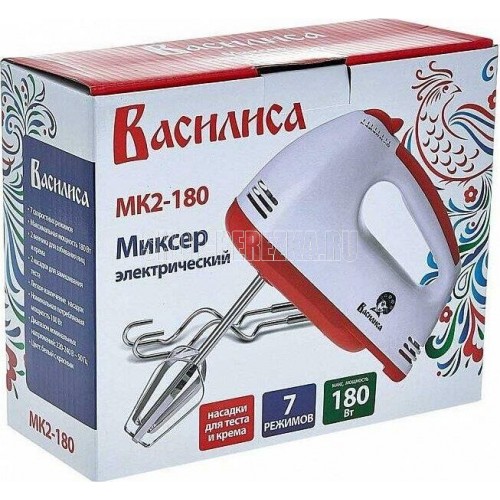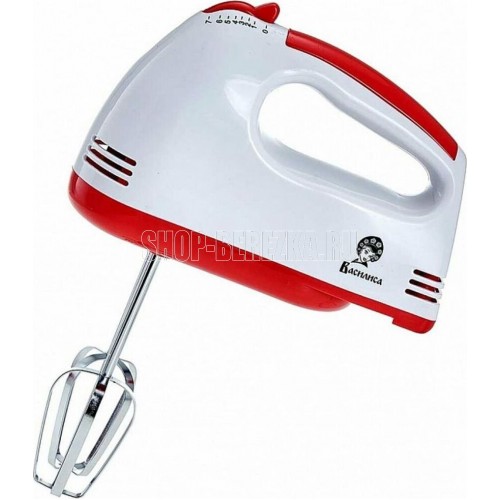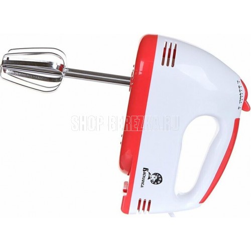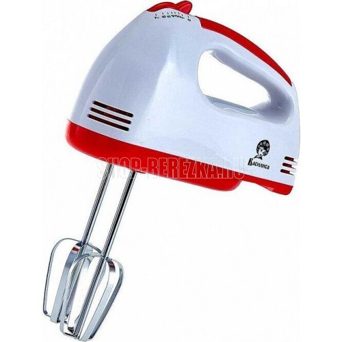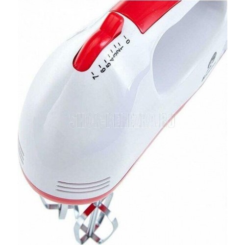 Максимальная мощность 180 Вт. Номинальная потребляемая мощность 100 Вт. Миксер предназначен для перемешивания продуктов, создания однородной массы и обогащения взбиваемой жидкости воздухом. Миксером взбивают и замешивают яйца, сливки, коктейли, мусс, омлет, легкое тесто, пюре, соусы и другие продукты. Корпус из высококачественного пластика. Цвет: белый с красным. Кнопка извлечения насадок. 2 венчика для взбивания яиц и крема. 2 насадки для замешивания теста. 7 скоростных режимов.