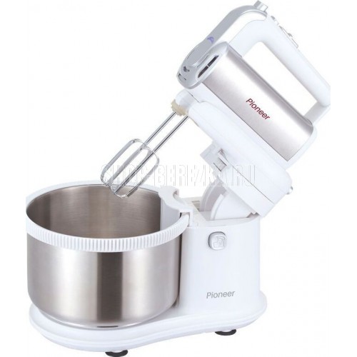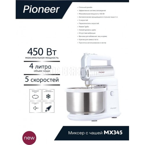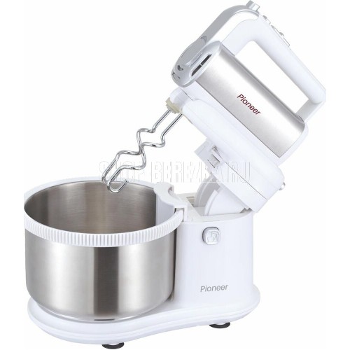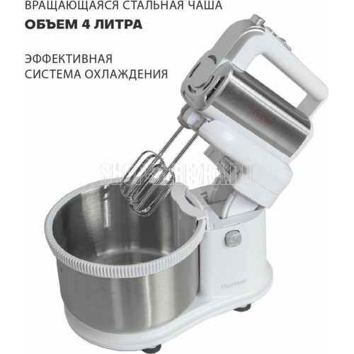 Миксер 2 в 1, ручной + стационарный, максимальная мощность 450 ватт, объем чаши 4 литра, автоматическая вращающаяся чаша, 5 скоростей, режим - Турбо, пониженный уровень шума, веньчики для взбивания яиц и крема, крючки для замеса теста