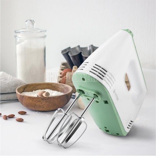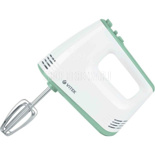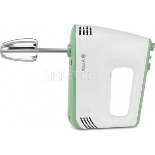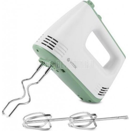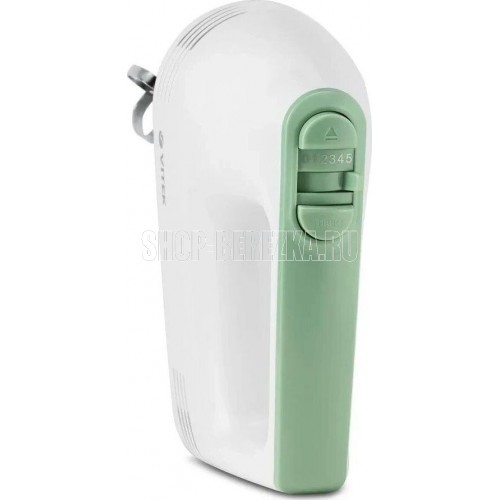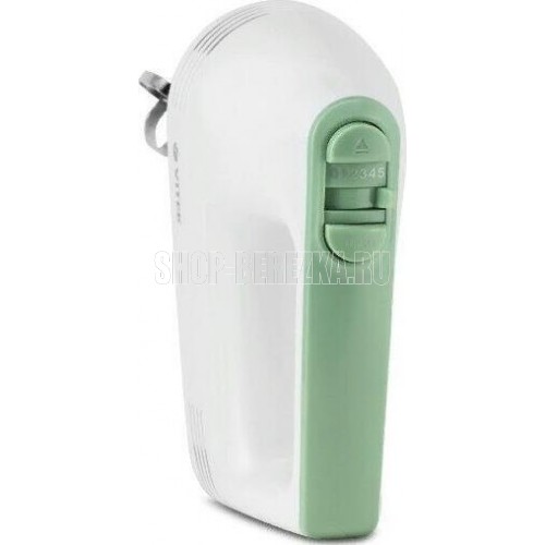 Миксер ручной. Мощность: 400 вт, Число скоростей: 5, Турборежим, Венчик для взбивания: 2, Крюки для замешивания теста, Количество насадок: 4, Кнопка отсоединения насадок, Материал корпуса: пластик, Длина сетевого шнура: 120 см, Цвет: Белый/зеленый