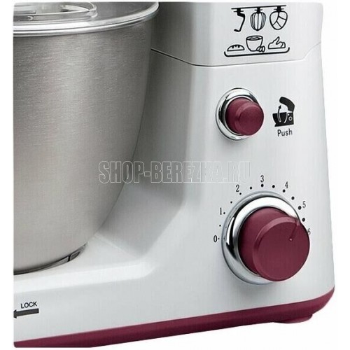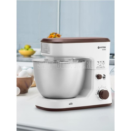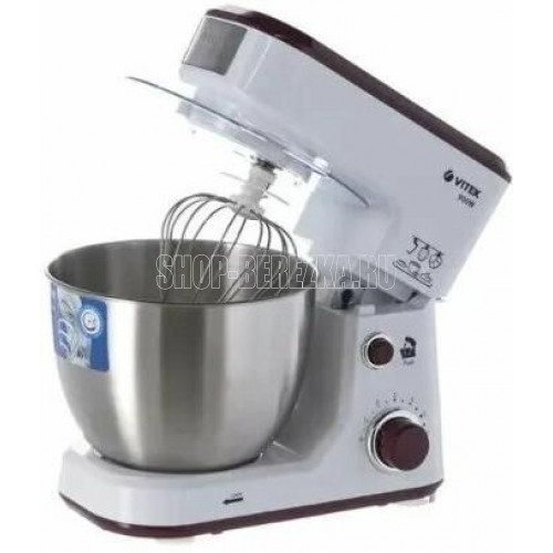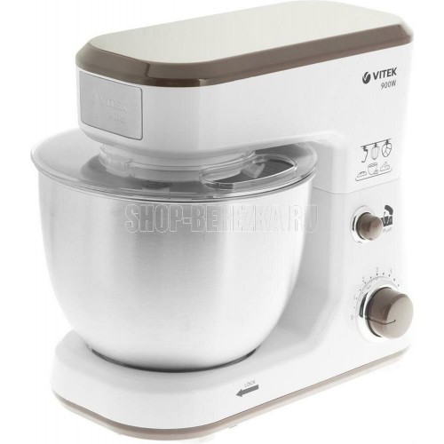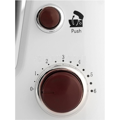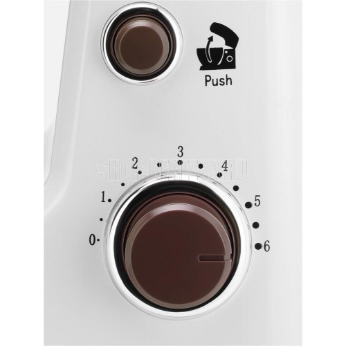 Планетарный миксер. Мощность: 900 вт, Число скоростей: 6, Венчик для взбивания: 1, Крюки для замешивания теста, Количество насадок: 3, Защитная крышка на чашу, Материал чаши: нержавеющая сталь, Объем чаши: 4 литра, Материал корпуса: пластик, Вес: 3,75кг., Длина сетевого шнура: 100 см., Цвет: Белый/коричневый
