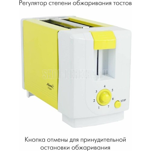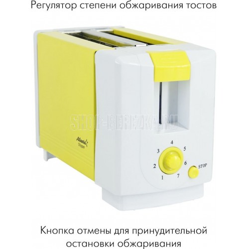 ATLANTA ATH-231 (YELLOW) Металлический корпус На два ломтика хлеба Регулятор времени поджаривания Поддон для крошек Автоматическое отключение Защита от перегрева Номинальная мощность 750 Вт 230 B ~ 50 Гц