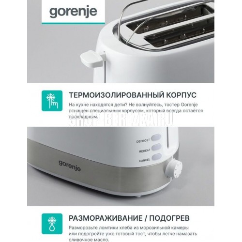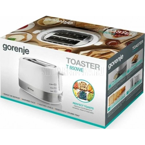 GORENJE T850WE Тостер, Материал: Пластик + металл, Цвет: Белый, Мощность нагревателя: 720 Вт, Мощность подключения: 850 Вт, Функция разморозки, Функция подогрева, Количество режимов нагрева: 7, Рычаг для извлечения тостов, Автоматическое поднятие тостов, Управление Управление Включение нажатием на кнопку Технические особенности Длина кабеля 82 см Доп. опции тостера Выдвижной поддон для крошек; Подогрев хлеба; функция разморозки Индикация тостера Индикатор работы оранжевый Мощность устройства 720 - 850 Вт Дополнительная информация Вес товара без упаковки (г) 1200 г Вес товара с упаковкой (г) 1800 г Высота предмета 18 см Высота упаковки 19.6 см Глубина предмета 16.7 см Глубина упаковки 16.4 см Материал корпуса пластик + металл Ширина предмета 30.7 см Ширина упаковки 34.2 см