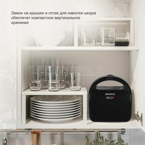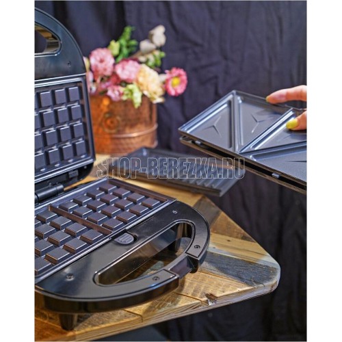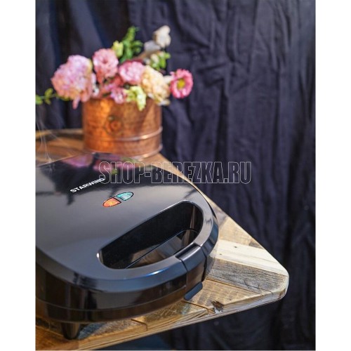 Мощность 750 Вт Съемные формы : пластины для вафель, сэндвичей, гриля 4 отделения для бутербродов 2 отделения для вафель Индикатор нагрева Автоматическое отключение (защитное) Замок фиксации закрытия крышки Цвет черный Срок гарантии 12 мес Ненагревающаяся ручка