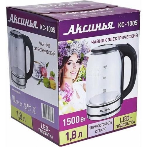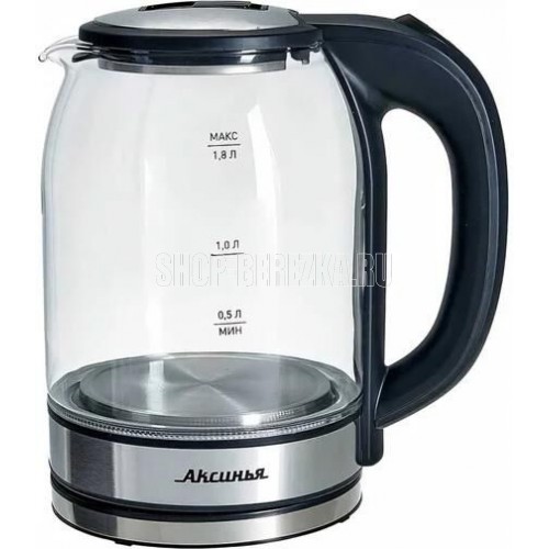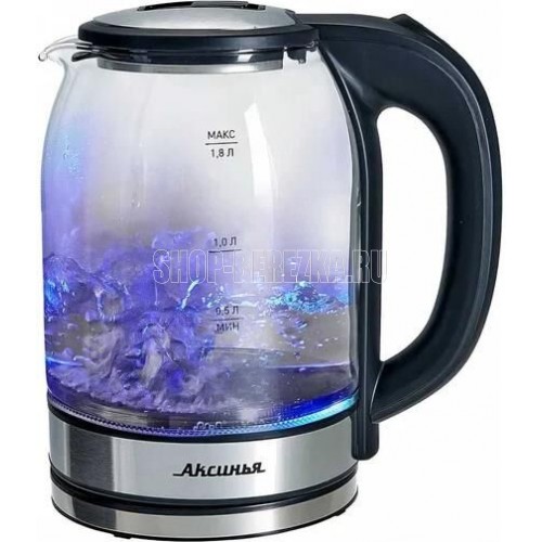 Объем 1,8 л. Номинальная потребляемая мощность 1500 Вт. Корпус из высококачественного термостойкого стекла. Закрытый нагревательный элемент из нержавеющей стали. Вращение корпуса на 360°. Цвет: черный. Шкала уровня воды. Внутренняя LED-подсветка. Отсек для хранения шнура питания. Автоматическое отключение при закипании. Блокировка включения без воды.