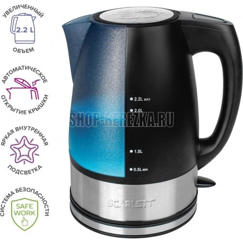 Материал корпуса: Пластик Внутренняя подсветка: Да Длина электрошнура, м: 0.7 Система многоуровневой безопасности «Safe Work»: Да Мощность, Вт: 2200 Объем, л: 2.2 Съемный фильтр: Да Отсек для хранения электрошнура: Да Индикатор работы: Внутренний световой индикатор Способ открывания крышки: Кнопка Индикатор уровня воды: Два индикатора уровня воды Беспроводное питание: Вращение на 360° Особенности модели: Большой объем Цвет: Черный