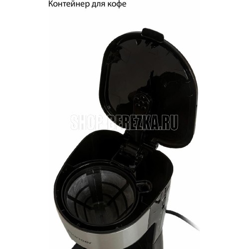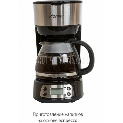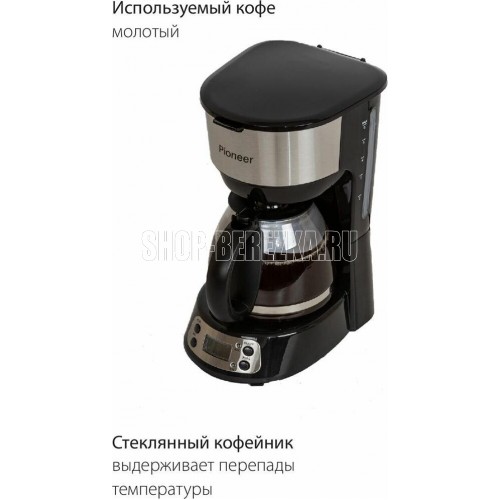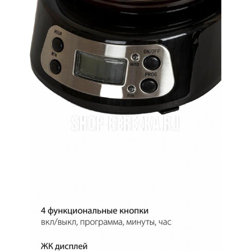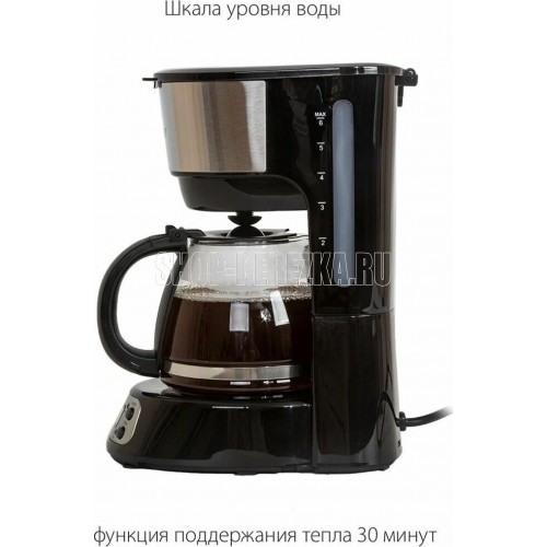 Кофеварка капельного типа, мощность 600Вт, емкость для воды 0,75 л, время заваривания: менее 8 минут, противокапельная система: 30-секундная защита от капель, нейлоновый фильтр, цифровое управление, ЖК-дисплей, подсветка, автоматическое отключение, функция поддержания температуры кофе, колба из термостойкого стекла