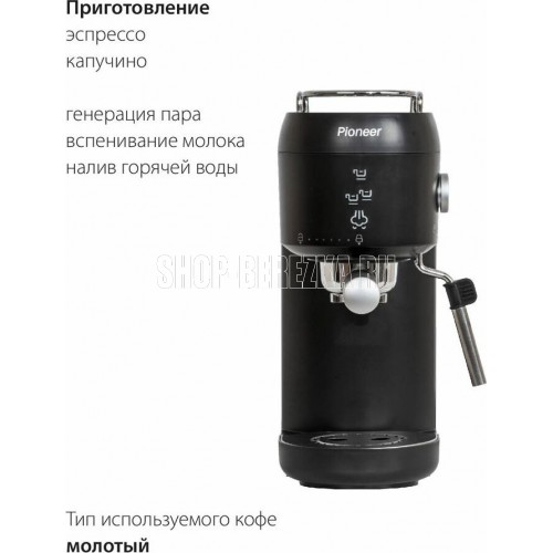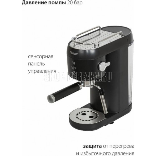 Кофеварка рожкового типа, Мощность 1400 Вт, Съемный резервуар для воды объемом 1,0 л, Помпа высокого давления 20 бар, Съемный стимер из нержавеющей стали, Сенсорное управление, Система быстрого нагрева термоблока для быстрого заваривания, Защита от перегрева и избыточного давления, Регулировка объема напитка, Съемный поддон для сбора капель объемом 170 мл, Подогрев кофейных чашек, Точный контроль температуры, Автоматическое отключение, Противоскользящие резиновые ножки, Фильтры на одну и на две чашки