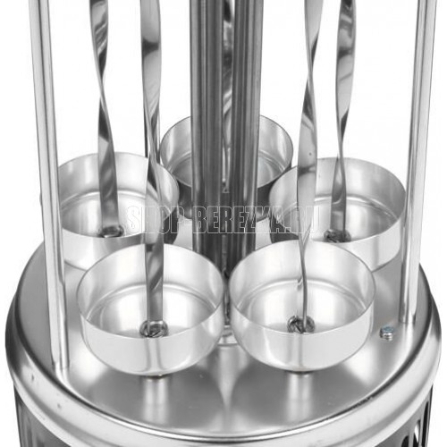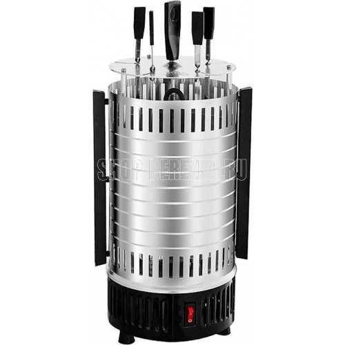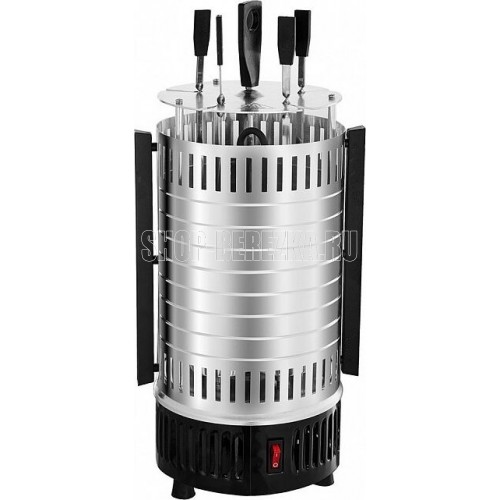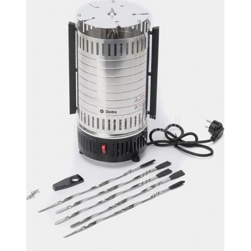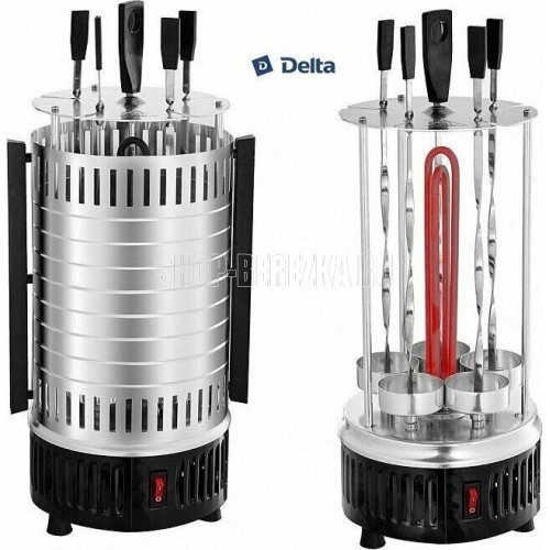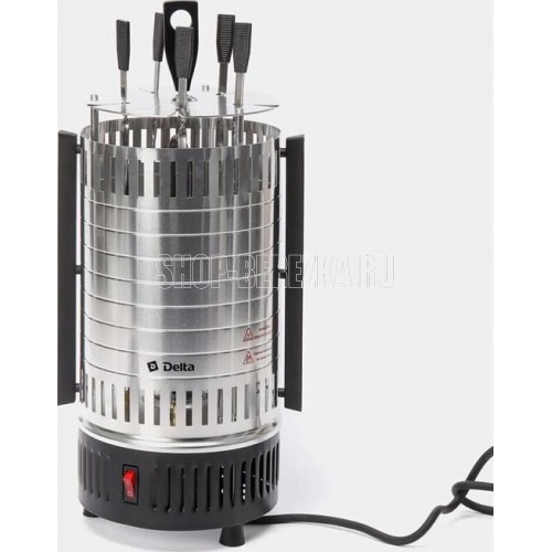 DELTA" DL-6700 Параметры Номинальная потребляемая мощность 1000 Вт Максимальная температура нагрева 255°С Количество шампуров 5 штук Длина шампура 33 см Максимальная загрузка 3 кг Частота вращения шампуров 2,5 об/мин Описание Электрошашлычница предназначена для использования в бытовых и аналогичных условиях и представляет собой устройство для приготовления гриля, шашлыка и других блюд из мяса, рыбы, овощей и др. Тип прибора - электрошашлычница с вертикальным расположением шампуров Вертикальный ТЭН из нержавеющей стали Тепловой экран из полированного алюминия с бакелитовыми ненагревающимися ручками 5 шампуров из нержавеющей стали с бакелитовыми ненагревающимися ручками 5 чашечек для сбора жира, предотвращающих загрязнение шашлычницы Кнопка включения/выключения на корпусе прибора со световым индикатором работы Функция автоматического вращения шампуров для равномерного и быстрого приготовления продуктов