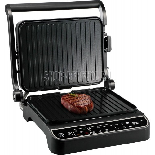 Контактный гриль Мощность – 2000 Вт Напряжение – 220-240 В, 50/60 Гц Управление – сенсорное Дисплей – есть Кол-во программ – 7 Жарочные панели – съемные, 2 штуки Антипригарное покрытие панелей – есть Съемный поддон для жира – есть Скребок для чистки гриля – есть