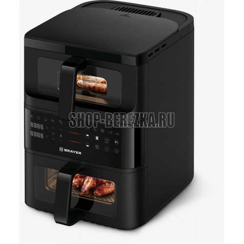 Мощность 2500 Вт Объем 10 л Объем верхней чаши 3,5 л Объем нижней чаши 6,5 л Индивидуальная настройка программ для каждой чаши 10 программ: фри, овощи, кекс, крылья, морепродукты, мясо, печенье, пицца, птица, колбаски Корпус из высокопрочного термостойкого пластика Функция подогрева пищи Сенсорное управление LED-дисплей Регулировка температуры 80–200 °С Таймер до 60 мин Съемные решетки с антипригарным покрытием Звуковой сигнал готовности блюда Электропитание 220-240 В, ~ 50-60 Гц