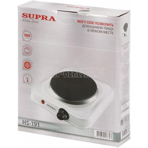 SUPRA HS-191 Основные характеристики Тип конфорок чугун Количество конфорок 1 Диаметр конфорок, см 15,5 Тип управления механическое Регулировка мощности есть Индикация Индикация включения в сеть есть Комплектация Комплектация плитка, гарантийный талон, инструкция на русском языке Корпус Материал корпуса металл с эмалевым покрытием Габариты и вес Вес в упаковке, кг. 1.4 Размер упаковки, см. (ВхШхГ) 6.5x22.5x26.5 Энергопотребление Потребляемая мощность, Вт. 1000 Электропитание, в., Гц. 220-240, 50