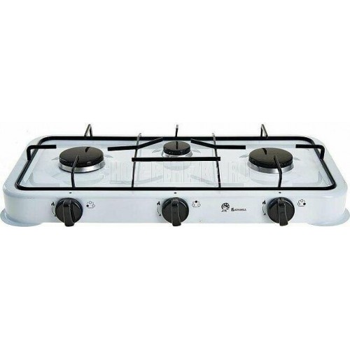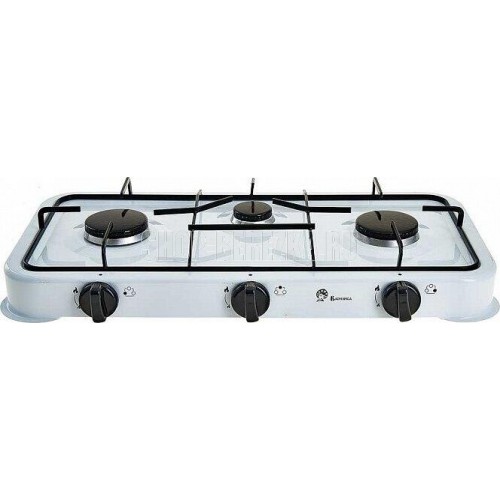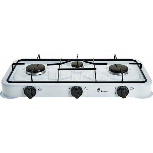 Параметры Номинальная тепловая мощность 2,2х2+1,0кВт Номинальный расход газа 393 г/ч Номинальное давление используемого газа 3,0 кПа Вид сжиженного газа пропан/бутан Количество конфорок 3 конфорки Тип настольная Тип розжига ручной