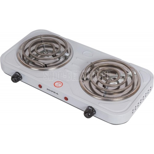 Электроплитка двуконфорочная. 2 спиралевых нагревательных элемента - 1000 Вт каждая; корпус покрыт жаропрочной эмалью; плавное регулирование температуры конфорки; количество уровней мощности - 5; световая индикация, диаметр конфорки - 14.4 см; прорезиненные ножки.