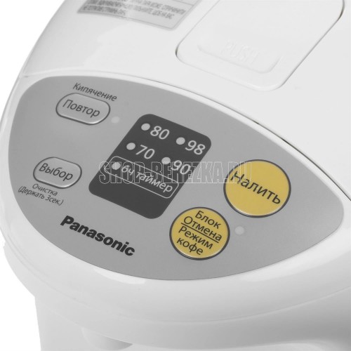 Термопот Panasonic/ белый, Мощность 700 Вт Объем 4 л Нагревательный элемент закрытая спираль Тип насоса электрический Ручная помпа для подачи воды нет Управление Управление кнопочное Регулировка температуры нет Функции Количество режимов нагрева 4 Температурные режимы 70, 80, 90, 98 °С Минимальная температура нагрева воды 70 °С Максимальная температура нагрева воды 98 °С Подогрев до заданной температуры да Поддержание тепла да Повторное кипячение да Защита и безопасность Защита от перегрева да Автоотключение при отсутствии воды да Дополнительные характеристики Шкала уровня воды да Индикатор уровня воды да Индикатор включения да Блокировка дозатора да Корпус Цвет белый Материал корпуса пластик Открывание крышки кнопка на крышке Ручка для переноски да Вращение на подставке на 360 градусов да Питание Источник питания сеть Длина сетевого шнура 0.75 м Комплектация Инструкция да Размеры и вес Высота 32.4 см Ширина 21.7 см