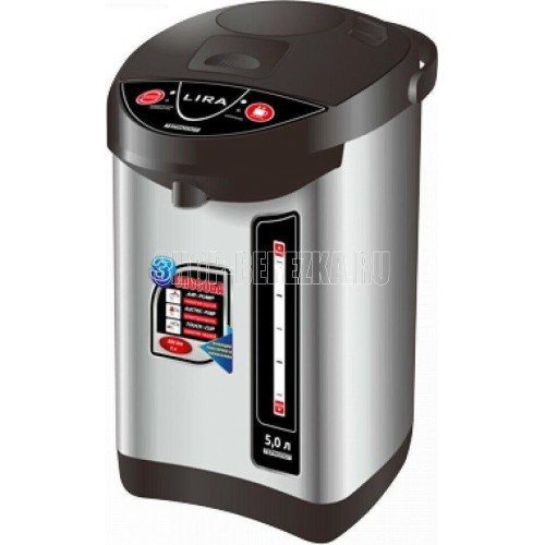 объем 5,0 л, мощность 800 Вт, 220В/50Гц, корпус и колба из нержавеющей стали, 3 способа подачи воды: при нажатии чашкой на клапан, с помощью насоса, с помощью электропомпы, Функция повторного кипячения, Ручка для переноски, Индикатор уровня воды.