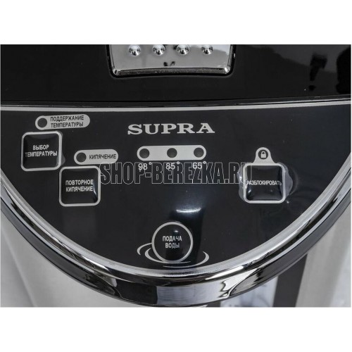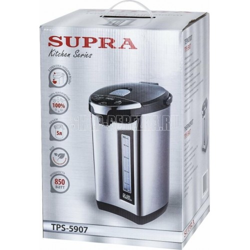 SUPRA TPS-5907 Основные характеристики Объем, л 5 Тип управления электронное Электрический насос есть Подача воды нажатием чашки есть Поворотное основание есть Функции Кипячение есть Повторное кипячение есть Поддержание температуры есть Выбор температуры есть Индикация Индикатор уровня воды есть Комплектация Комплектация термопот, гарантийный талон, инструкция на русском языке Корпус Материал внутренней камеры нержавеющая сталь Энергопотребление Потребляемая мощность, Вт. 850 Мощность в режиме поддержания температуры, Вт 70 Электропитание, в., Гц. 220-240, 50 Артикул TPS-5907