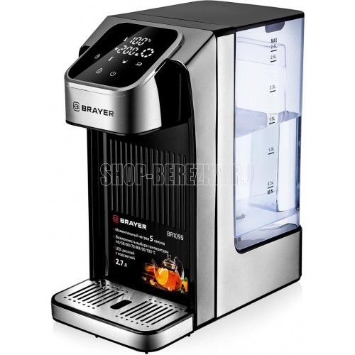 Мощность 2600 Вт Съёмный резервуар для воды объёмом 2.7 л LED-дисплей с подсветкой Сенсорное управление Возможность выбора температуры 40/45/50/60/70/80/90/100 °С Моментальный нагрев 5 секунд Блокировка подачи воды Корпус из нержавеющей стали Съёмный поддон для капель Отключение при отсутствии воды Защита от перегрева Электропитание 220-240 В, ~ 50-60 Гц