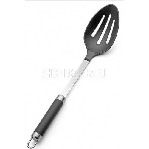 Ложка предназначена для перемешивания продуктов в процессе варки, жарки или тушения, для извлечения продуктов из супов и бульонов, для подачи готовых блюд. Прорези на ложке позволяют стекать излишкам масла, соуса или жидкостей. Изделие прекрасно подойдет для посуды с антипригарным, тефлоновым или керамическим покрытием. Рабочая часть ложки выполнена из пищевого пластика и выдерживает температуру до 210?. Рукоятка имеет приятное на ощупь покрытие, которое ограничивает скольжение ложки в руке во время использования. Размер изделия 32*5 см. Материалы изготовления: нейлон, нержавеющая сталь, пищевой пластик TPR.